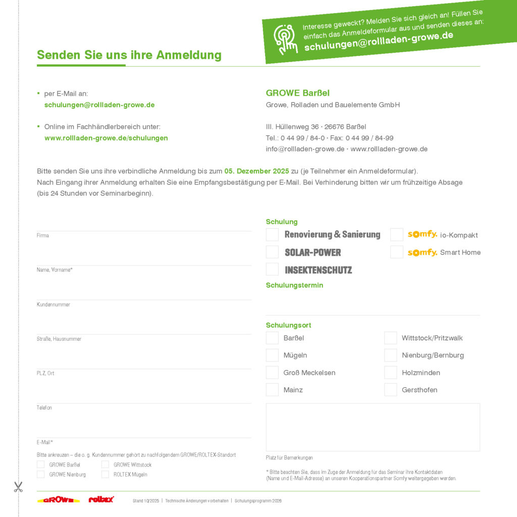 Klicken Sie auf www.rollladen-growe.de/schulungen oder scannen Sie den QR-Code, wählen Sie ein Seminar, füllen Sie das Anmeldeformular aus und senden es ab – oder senden Sie das ausgefüllte PDF direkt an schulungen@rollladen-growe.de